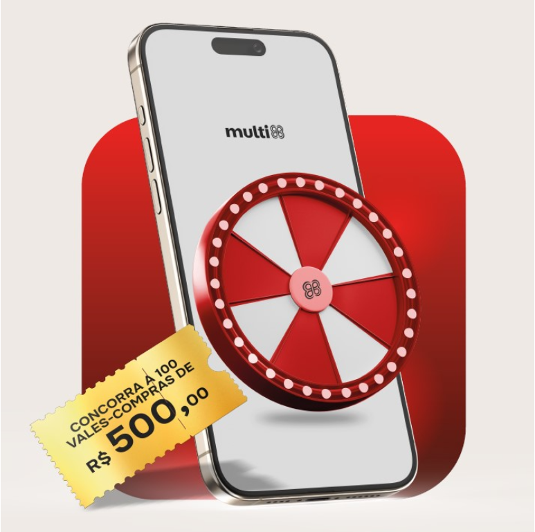 Para rodar a Roleta Premiada Black Friday basta cadastrar as notas fiscais no app Multi. R$800 em compras valem chances para ser presenteado com os 100 Cartões Vales-Compras de R$500: